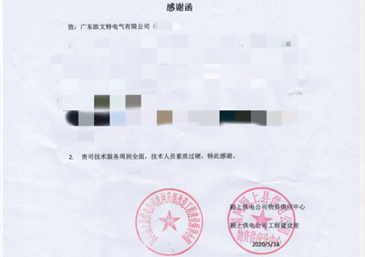 【喜訊】歐文特電氣收到了國家電網的書面感謝函